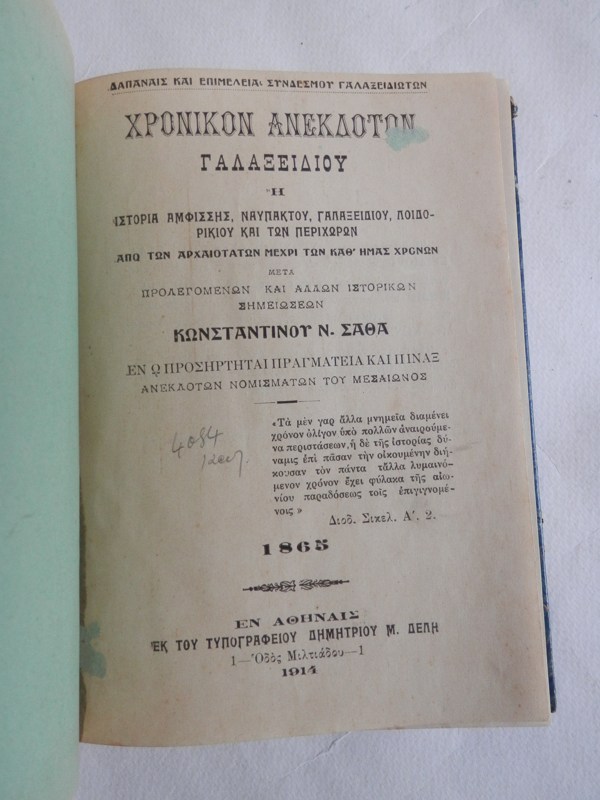 Συγγραφέας : Η ιστορία Αμφίσσης,Ναυπάκτου,Γαλαξειδίου,Λοιδορικίου και των περιχώρων από των αρχαιοτάτων μάχρι των καθ’ημάς χρόνων μετά προλεγομένων και άλλων ιστορικών σημειώσεων ΚΩΝ/ΝΟΥ ΣΑΘΑ